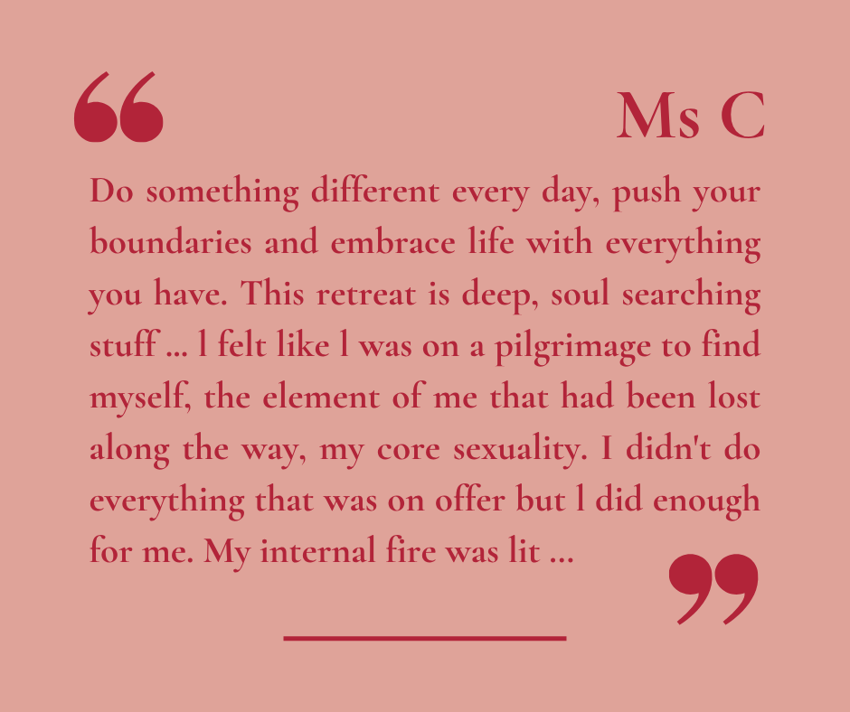 Although there is an amazing team of qualified sex coaches and facilitators ready to talk and hold you in things that arise, this retreat is suitable for those who know that they can responsibly hold themselves with anything that may arise for them on the retreat. It may not be suitable for those with unaddressed ptsd or current trauma. Please reach out before booking if you are at all unsure at info@katelambertcoaching.com
