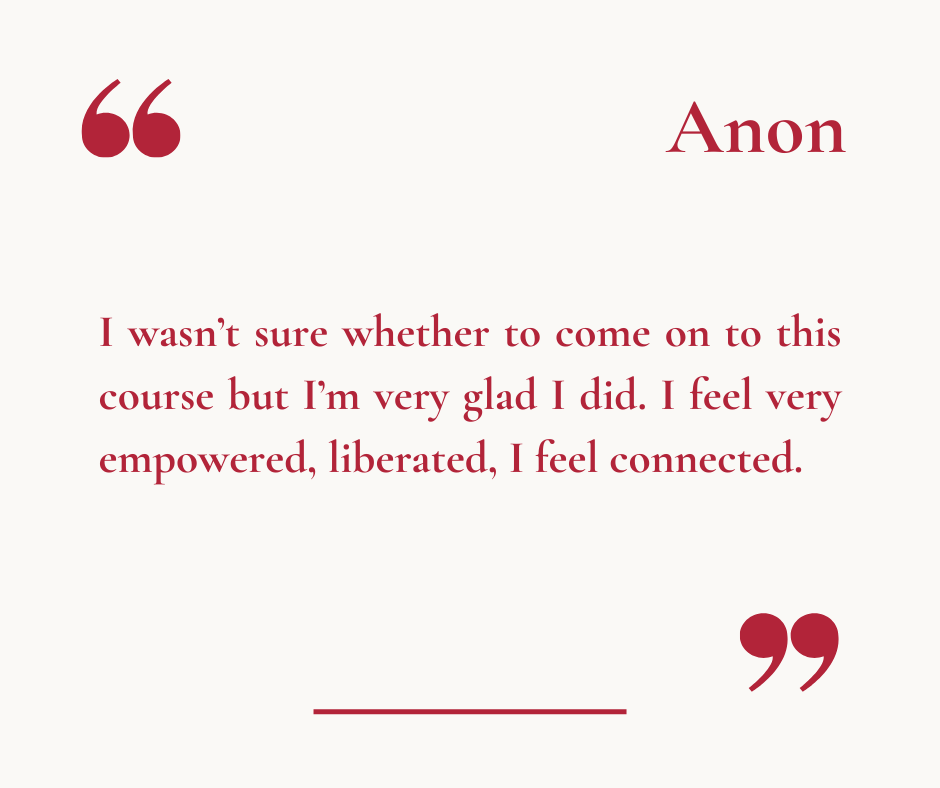 - A live Q and A session around the course, useful for sharing what’s coming up for you, being witnessed and having support with issues, challenges and queries.